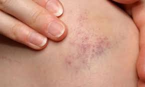 มีจุดแดง ขนาด 1 มม. หรือเท่าปลายเข็มหมุด หรือจ้ำเขียว พรายย้ําขนาด 10 มม. หรือเป็นรอยแดง แผ่บางกว้างๆ ขึ้นตามผิวหนัง เมื่อใช้มือดึงหนังส่วนนั้นให้ตึง จุดหรือจ้ำเหล่านี้ ไม่จางหาย จุดแดงหรือจ้ำเขียวอาจเกิดแยกกันโดดๆ หรือเกิดร่วมกันก็ได้