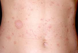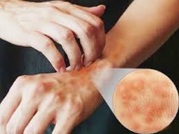 ผิวหนังขึ้นเป็นผื่น ตุ่ม หรือวงด่าน ซึ่งมีอาการคัน